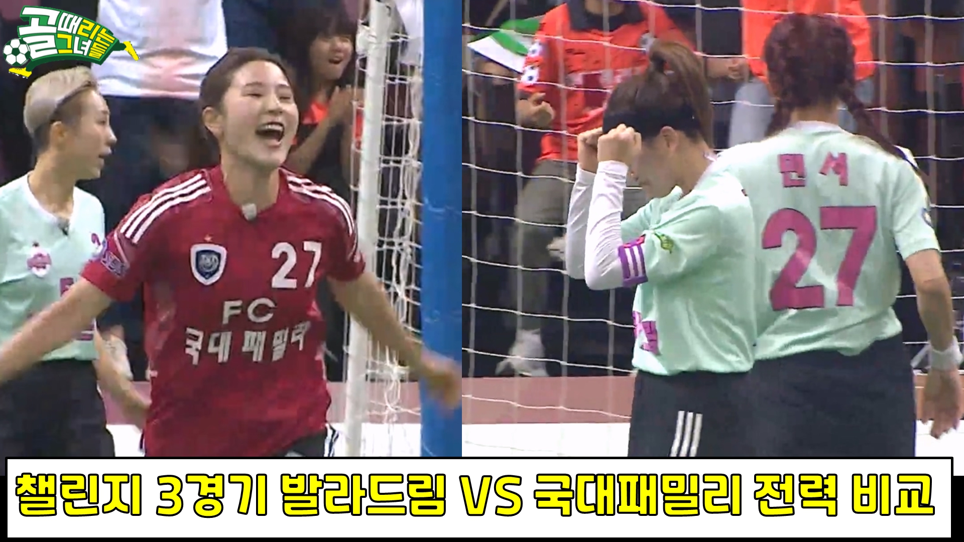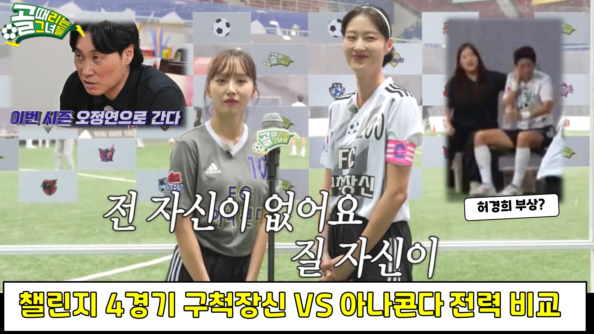 먼저, 챌린지리그 진행상황입니다.1위 발라드림, 2경기 1승 1패, 6 득점 2 실점, 골득실 +4, 2위 구척장신, 1경기 1승 0패, 3 득점 0 실점, 골득실 +3 3위 국대패밀리, 2경기 1승 1패, 2 득점 4 실점, 골득실 마이너스 2, 4위 아나콘다, 1경기 0승 1패, 0 득점 5 실점, 골득실 마이너스 5입니다. 지금까지 챌린지리그는 3개의 경기가 방영되었으며, 구척장신과 아나콘다, 발라드림과 구척장신, 아나콘다와 국대패밀리의 경기를 남겨 놓고 있습니다. 팀 전적 비교입니다.구척장신 35경기 16승 19패로 승률 45.7%, 67 득점 67 실점 득실차 0이며 최고 성적은 제2회 슈퍼리그 준우승, 제1회 SBS컵 준우승입니다. 직전 경기인 국대패밀리와의 경기를 승리로 이끌면서 현재 1..